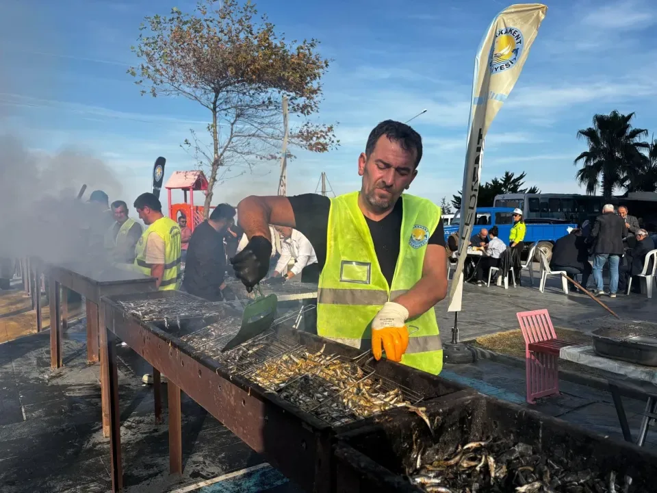 Temizlenen hamsiler, vatandaşlar ve belediye personelince metrelerce kurulan mangallarda pişirilerek dağıtıldı.
