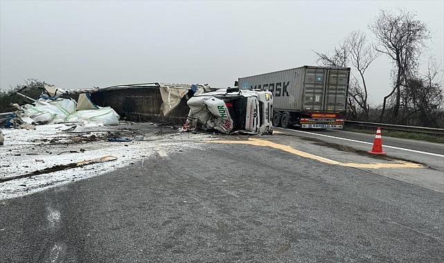 Anadolu Otoyolu'nun Düzce kesiminde plastik granül yüklü tırın devrilmesi sonucu 1 kişi yaralandı.Otoyolun İstanbul istikametinde seyreden Murat Işık idaresindeki 76 AAR 550 plakalı plastik granül yüklü tır, Gölyaka gişelerine 1,5 kilometre kala refüjü çevreleyen bariyerlere çarparak devrildi.Kazanın ardından tırın dorsesinde bulunan plastik granül otoyola döküldü.İhbar üzerine bölgeye polis, jandarma, sağlık ve Karayolları ekipleri sevk edildi.Yaralanan Işık, sağlık ekipleri tarafından yapılan ilk müdahalenin ardından hastaneye kaldırıldı.Diğer yandan Karayolları ekipleri otoyolun 2 şeridini dubalarla çevirerek ulaşıma kapattı.Tek şeritten trafiğin aktığı bölgeye tırın ve dökülen malzemelerin kaldırılması için iş makinesi ve vinç sevk edildi.