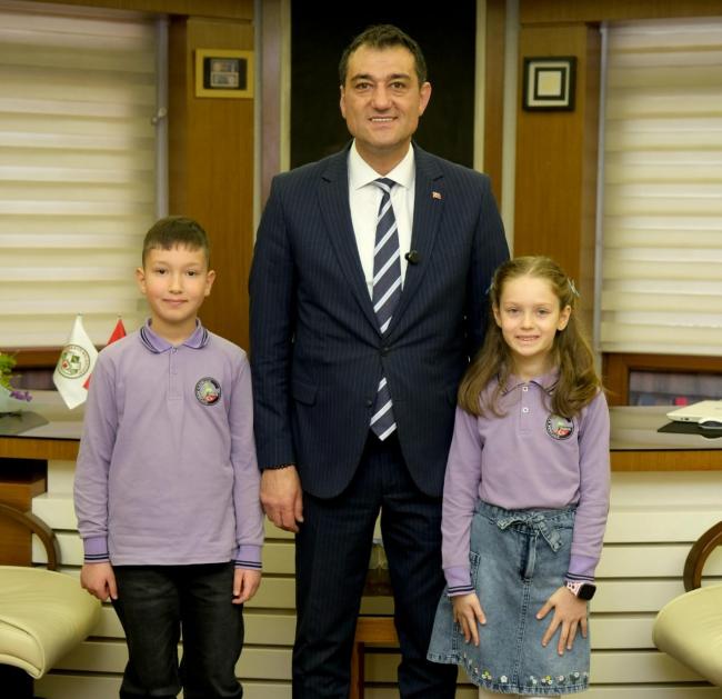 Öğrenciler Belediye Başkanı Fuat Köse’ye çiçek verirken, Başkan Köse’de kendilerine zekâ oyunu takımı hediye etti.Haber Merkezi