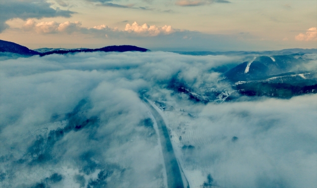 D-655 Düzce-Zonguldak Batı Karadeniz bağlantı yolunda sis etkisini gösteriyor.Kara yolunun Şifalı Su, Tepeköy ve Kabalak mevkilerinde yaklaşık 1 haftadır devam eden kar yağışının durmasıyla sis etkili oldu.Sisin görüş mesafesini düşürdüğü yolda sürücüler dikkatli ilerliyor. Güzergahta bulunan trafik ekipleri, sürücüleri yakın takip, hatalı sollama ve aşırı hız yapmamaları konusunda uyarıyor.Dik rampaların yanı sıra keskin virajların da bulduğu 34 kilometrelik D-655 Düzce-Zonguldak Batı Karadeniz bağlantı yolunun Akçakoca kesiminde etkili olan sis ve yamaçları kaplayan kar havadan görüntülendi.