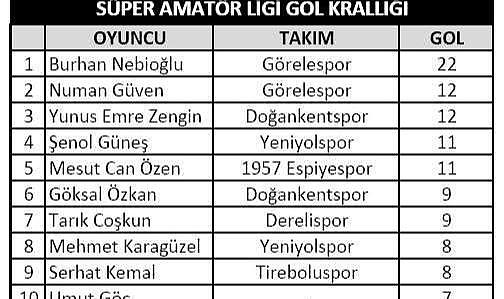 Süper Amatör Ligi'nde heyecan tüm hızıyla sürerken, gol krallığı yarışında Burhan Nebioğlu açık ara farkla liderliğini sürdürüyor.