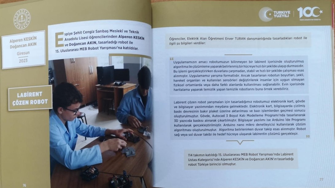 15. Uluslararası MEB Robot Yarışması'nda Labirent Ustası Robot Kategorisinde Türkiye birincisi olan Espiye Şehit Cengiz Sarıbaş Mesleki ve Teknik Anadolu Lisesi öğrencileri Alperen Keskin ve Doğancan Akın, öğretmenleri Enver Duran danışmanlığında tasarladıkları robot ile derginin "İstikbalin Yüzyılında Öğrencilerimiz" bölümünde yer aldı.