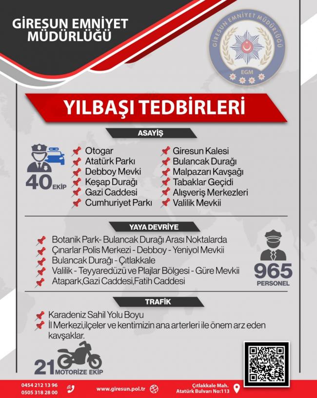 Giresun'daki güvenlik tedbirleri kapsamında, 1.537 kolluk görevlisinin yanı sıra 186 polis ve jandarma ekibi ile 5 sahil güvenlik yüzer unsuru görev yapacak. Vali Serdengeçti, alınan önlemlerin vatandaşların yılbaşı gecesini huzur içinde geçirmelerini sağlamak amacıyla titizlikle uygulandığını kaydetti.Yetkililer, vatandaşlardan herhangi bir olumsuz durumla karşılaşmaları durumunda kolluk kuvvetlerine başvurmalarını istedi. Yılbaşı akşamı boyunca 112 Acil Çağrı Merkezi'nin yanı sıra polis, jandarma ve sahil güvenlik birimlerinin aktif olarak görevde olacağı belirtildi.Bu kapsamda, güvenlik güçlerinin kararlılığı ve koordinasyonuyla Giresun'da yeni yıl kutlamalarının sorunsuz bir şekilde geçmesi hedefleniyor.Abdullah Akçay
