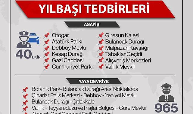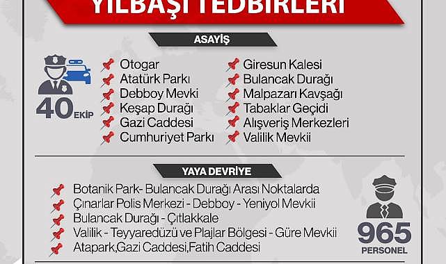 Giresun'da vatandaşların yeni yılı huzur ve güven içinde karşılaması için güvenlik güçleri seferber oldu. İl genelinde, yılbaşı gecesi 1.537 kolluk kuvveti görev yapacak.Giresun Valisi Mehmet Fatih Serdengeçti, İçişleri Bakanlığı'nın talimatları doğrultusunda, yılbaşı gecesi vatandaşların güvenliğini sağlamak amacıyla alınan önlemlerin en üst seviyeye çıkarıldığını belirtti. Vali Serdengeçti, halkın yoğun olarak bulunduğu marketler, misafirhaneler, yurtlar, ibadethaneler ve umuma açık alanlarda güvenlik tedbirlerinin artırıldığını ifade etti. Bu alanlarda yeterli sayıda kolluk personeli, araç ve ekipman görevlendirildiğine dikkat çekti.