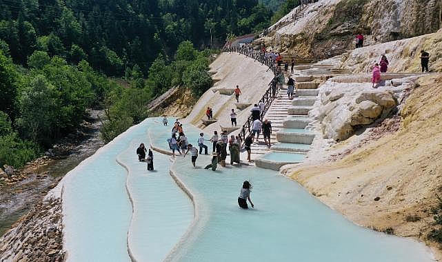 "Giresun'un Pamukkalesi" olarak anılan Göksu travertenlerinin, yapılacak genişletme çalışmaları ve Mavi Göl'e uzanacak yürüyüş yoluyla turizmden daha fazla pay alması hedefleniyor.Dereli ilçesine bağlı Pınarlar köyünde bulunan Göksu travertenlerinde, Giresun Valiliği İl Özel İdaresi Kültür ve Sosyal İşler Müdürlüğünce 2020'de başlatılan projeyle teras şeklinde büyüklü küçüklü çok sayıda gölet oluşturuldu.Doğu Karadeniz Kalkınma Ajansının (DOKA) da desteğiyle 2022'de ziyarete açılan travertenler, mineralli suyun aktığı beyaz taşlar ve turkuaz renkli göletleriyle "Giresun'un Pamukkalesi" olarak kısa sürede adından söz ettirmeye başladı.Ziyaretçi sayısı her geçen gün artan travertenlerin turizmden daha çok pay alabilmesi için yeni projeler hazırlandı.İl Genel Meclisi Başkanı Ahmet Şahin, AA muhabirine, Göksu travertenlerinin 2 yıl önce bölge turizmine kazandırıldığını söyledi.Bölgenin kısa zamanda büyük ilgi gördüğünü belirten Şahin, "Geçen yıl 300 bin misafirimiz vardı. Bu yıl 500-600 bin ziyaretçi öngörüyoruz." dedi.Şahin, Göksu travertenlerinde bu yıl yeni projeleri hayata geçireceklerini ifade ederek, şöyle konuştu:"Üst bölgede 30 dönüme yakın araziyi istimlak ettik. Şu an mülkiyeti İl Özel İdaremiz adına. Aynı zamanda yan tarafta özel mülkiyetle ilgili bir yerimiz vardı, onun kamulaştırmalarını da yaptık, vatandaşlarımızla uzlaşı halindeyiz. Bu bölgeye gelen misafirlerimizin rahatça araçlarını park etmelerini, hediyelik eşyalarını almalarını, ayaklarını suya sokmalarını, sağlıklı ve huzurlu şekilde buradan ayrılmalarını istiyoruz. Kafelerimizi de düşünüyoruz, hediyelik eşya yerlerimiz de hazırlandı. Bunları işletmecilere verip insanları burada ağırlayacağız inşallah."- "Mavi Göl ile Göksu travertenlerini 2 kilometrelik yürüyüş yoluyla birbirine bağlayacağız"Göksu Deresi'nde büyüklü küçüklü dört gölden oluşan Mavi Göl'ün de aynı vadide bulunduğuna dikkati çeken Şahin, "Mavi Göl ile Göksu travertenlerini 2 kilometrelik yürüyüş yoluyla birbirine bağlayacağız." dedi.Şahin, Şebinkarahisar yolu üzerindeki tarihi Halil Rıfat Paşa Tüneli'ni de bu destinasyon alanına katıp bölgeyi Kulakkaya ve Kümbet yaylaları arasında tam bir turizm bölgesi haline getirmeyi düşündüklerini sözlerine ekledi.AA