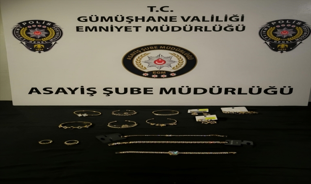 Gümüşhane'de bir işyerinden hırsızlık yaptığı belirlenen şüpheli gözaltına alındı.Valilikten yapılan açıklamaya göre, Hasanbey Mahallesi Cumhuriyet Caddesi'ndeki bir işyerinden hırsızlık yapıldığı ihbarı üzerine polis ekipleri çalışma başlattı.Ekipler, olayla ilgili güvenlik kamerası kayıtlarında şüphelinin Y.Ö. olduğunu tespit etti.Torul ilçesinde yakalanan şüphelinin üzerinden 6 adet kelepçe bileklik, 5 çift küpe, 3 adet bilezik, 2 adet yüzük ile 16 parça takı malzemesi ele geçirildi.