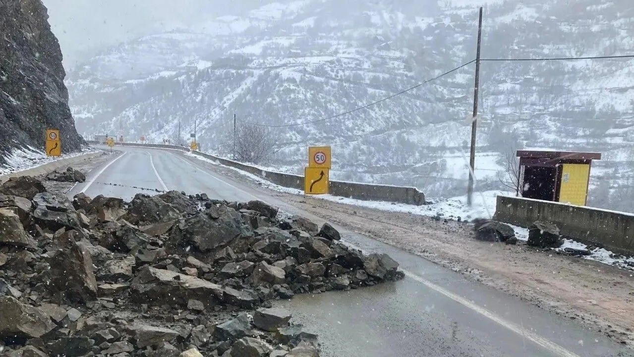 Yoğun yağış sonrası yamaçtan kopan kaya kütleleri nedeniyle trafik çift taraflı olarak dururken, bölgeye karayolları ekipleri sevk edildi.
