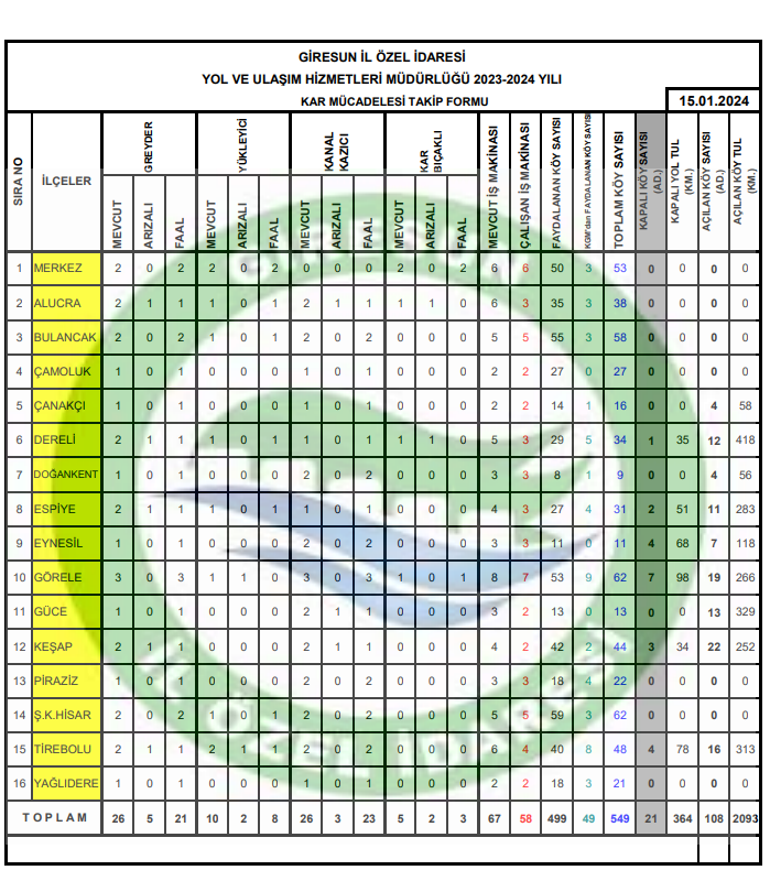 Giresun İl Özel İdaresi ekiplerinin karla mücadele çalışmaları, vatandaşların güvenli bir şekilde ulaşım sağlamalarını amaçlıyor. Giresun'un genelindeki köy yollarının tamamının trafiğe açılması için ekiplerin yoğun çabalarının sürdüğü belirtildi. Vatandaşların kar yağışına karşı dikkatli olmaları ve gerekli tedbirleri almaları konusunda uyarılar yapılıyor.