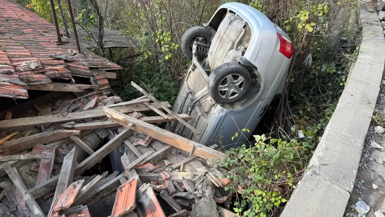 Zonguldak'ta otomobilin bir evin çatısına düştüğü kazada hasar oluştu.