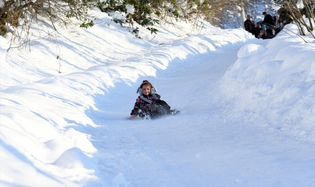 GÖKSEL CÜNEYT İĞDE/SAMET KALYONCU - Düzce'nin Gölyaka ilçesinde dağ köyünde yaşayan çocukları dijital bağımlılıktan kurtarmak için traktörüyle kızak pisti yapan muhtar, amacına ulaşmanın mutluluğunu yaşıyor.İl merkezine 40, ilçe merkezine ise 15 kilometre uzaklıkta yer alan 800 rakımlı Bakacak köyünde son yağışların ardından kar kalınlığı 80 santimetreye ulaştı.Muhtar Mehmet Çiçek, traktörüne bağladığı kürekle köyün patika yollarında biriken karı temizlerken, zamanlarının büyük bölümünü evlerinde televizyon, tablet ve akıllı telefon başında geçiren çocuklar için kızak pisti oluşturmaya karar verdi.Ormanlık alanda kalan yaklaşık 150 metre uzunluğundaki patika yolu traktörüyle düzleştiren ve yan kısımlarına da güvenlik için set oluşturan Çiçek'in hazırladığı piste aileleriyle gelen çocuklar, muşamba, poşet ve tahta parçalarıyla kayarak karın keyfini çıkarıyor.Çiçek, AA muhabirine, köyde çocukluk ve gençlik yıllarında dijital mecraların bu kadar yaygın olmadığını ve kışın karda eğlendiklerini anlattı."Çocuklar da bizim eski dönemlerimizde gibi eğlensinler, telefondan, tabletten biraz uzak dursunlar, sosyal aktiviteleri olsun istedim." diyen Çiçek, kendi çocuklarını bile internetten, telefondan, televizyondan alıkoyamadığını, "köydeki bütün çocuklar dışarı çıksın" düşüncesiyle harekete geçtiğini belirtti.Çiçek, köy halkının çevre şehirlerdeki kayak merkezlerine gitme imkanı bulamadığına değinerek, çocukların böyle eğlendiklerini görmenin kendisini de mutlu ettiğini, zaman zaman büyüklerin de pistte kayarak çocukluklarını yaşadığını ifade etti.- "Burada geçirdiğim vakit benim için daha değerli ve eğlenceli"Kızak pistinde annesiyle gelen 6 yaşındaki Ömer Ayaz, çok eğlendiğini dile getirerek, "Poşetin önünü kaldırıyorum. Daha sonra geriye doğru yatarak ayaklarımı da kaldırıp kayıyorum, çok zevkli." dedi.Pist yapılmadan önce zamanının büyük bölümünü evde telefonda oyun oynayarak geçirdiğini anlatan 11 yaşındaki Asel Akdeniz, bundan dolayı zaman zaman gözünün karardığını ancak arkadaşlarıyla karda kaymanın çok daha eğlenceli olduğunu kaydetti.17 yaşındaki Yusuf Aygün, köyde zamanının büyük kısmını artık kızak pistinde geçirdiğini belirterek, "Evde teknolojik aletlerle vakit geçirmek yerine burada geçirdiğim vakit benim için daha değerli ve eğlenceli. Muhtarımız iyi ki böyle bir şey düşünmüş." ifadelerini kullandı.
