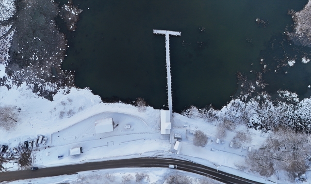 Düzce'nin Gölyaka ilçesinde yer alan Efteni Gölü'nün yüzeyi kısmen buz tuttu.İlçe merkezine 5, Düzce merkeze 25 kilometre mesafedeki gölün bulunduğu havzada kar yağışının ardından soğuk hava etkili oldu.Geçen yıl 22 türden 2 bin 111 kuşun kayıt altına alındığı gölün bulunduğu alanda kış manzaraları oluştu.Yüzeyinde adacıkları andıran parça parça buz tabakalarının oluştuğu gölün yüzeyi ve beyaz örtüyle kaplanan çevresi havadan görüntülendi.Soğuk havaya rağmen bölgeyi ziyaret eden doğaseverler, göl ve çevresindeki kartpostallık manzaraları fotoğrafladı.