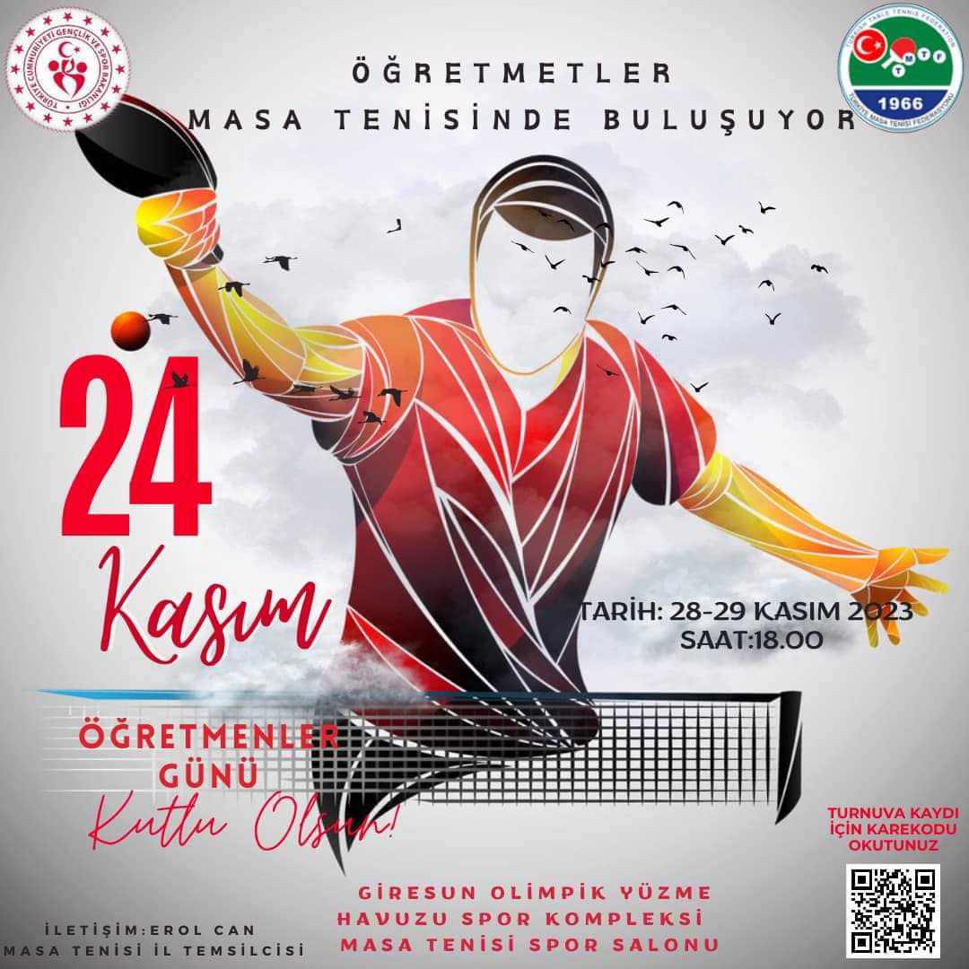 Gençlik ve Spor İl Müdürlüğü masa tenisi İl Temsilciliği tarafından 24 Kasım Öğretmenler Günü kapsamında ilimiz genelindeki öğretmenlerin katılımlarıyla Kadın/Erkek Masa Tenisi müsabakaları düzenlenecek.28-29 Kasım 2023 tarihlerinde, saat 18.00-23.00 arasında Olimpik Yüzme Havuzu Spor Kompleksi Masa Tenisi Spor Salonunda organize edilecek olan turnuvanın kayıtları için; Resimdeki Karekod formu doldurularak veya yarışmanın yapılacağı yerde hazır bulunulması gerekmektedir.İletişim: Erol CAN/Masa Tenisi İl Temsilcisi : 05365541448