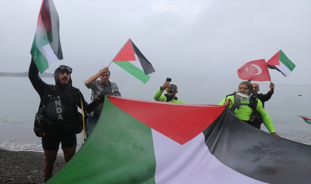 Eğitim Araştırma Yardımlaşma ve Arama Kurtarma Derneği (ANDA) Trabzon İl Başkanı Yunus Ersoy ile ekip amiri Zafer Koçal, İsrail'in Gazze'ye saldırılarına dikkati çekebilmek için Karadeniz'de dalış gerçekleştirdi.Çayeli ilçesindeki Limanköy Plajı'nda düzenlenen etkinliğe katılanlar, mehter marşı eşliğinde Türk ve Filistin bayrakları açtı.ANDA Trabzon İl Başkanı Ersoy ile ANDA Rize ekip amiri Koçal, katılımcıların alkışlarıyla kıyıdan denize girdi.Bir süre deniz altında gezen Ersoy ve Koçal, Türk ve Filistin bayrakları açtı.Ersoy, denizden çıktıktan sonra yaptığı açıklamada, Gazze'ye ulaşılabilmesi için farkındalık oluşturmaya çalıştıklarını söyledi.Türk toplumunun her zaman mazlumun yanında olduğunu belirten Ersoy, "Bu farkındalığı 'Türk beklenendir' sloganıyla yaptık. Kafkaslardan Balkanlara, yedi iklim ve her kıtada tarihte olduğu gibi bugün de olmaya devam edeceğiz. Bizim su altında nefes alırken çıkardığımız her bir kabarcığın Gazze'deki kardeşlerimize dua olarak gitmesi dileğiyle bu farkındalık etkinliğini yaptık." diye konuştu.Etkinliği dernek üyeleri ile vatandaşlar takip etti.