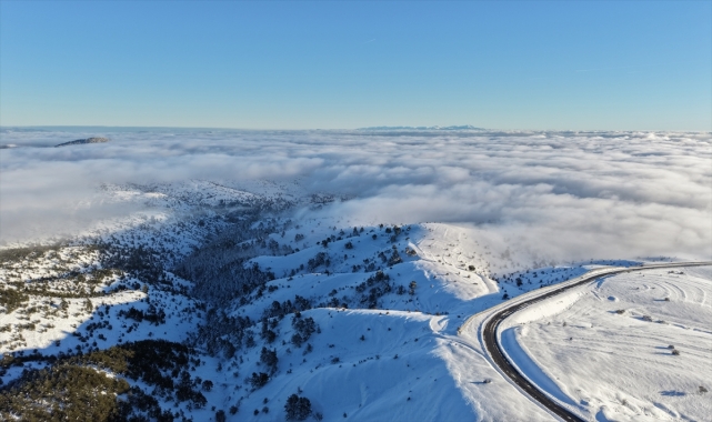 Samsun'un Alaçam ilçesinde karla kaplanan Dürtmen Dağı'nda oluşan sis dronla kaydedildi.Alaçam sınırlarında kalan Dürtmen Dağı, ilçe merkezine 33 kilometre mesafede bulunuyor.Son günlerde etkili olan soğuk havanın ardından dağ, yağan kar sonrası beyaz örtüyle kaplandı.Karla kaplı dağın üzerinde oluşan sis, etkileyici görüntü ortaya çıkardı.Dağın sis altındaki görüntüsü dronla kaydedildi.